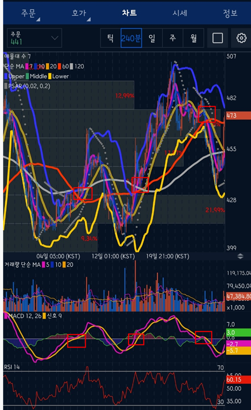 MACD선과 시그널선의 교차에 따른 시세변화에 비교